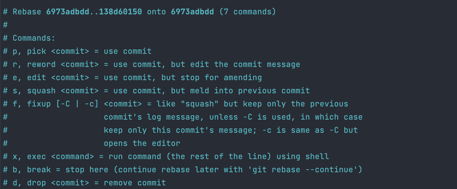커밋마다 앞에 pick이라는 키워드가 있는데, 이는 리베이스에서 커밋을 재조정할 때 사용하는 명령어라고 보면 되고, 모든 명령어들의 기본값이다.