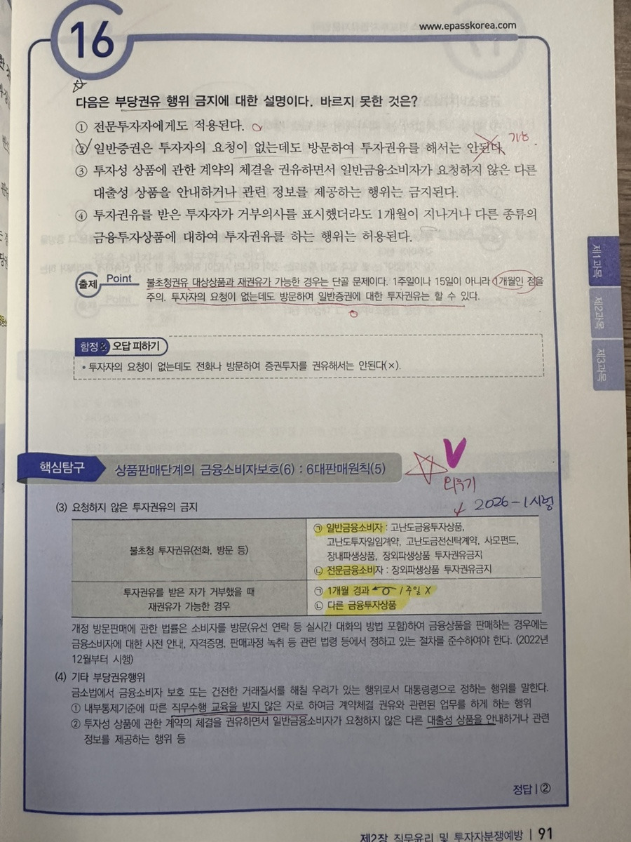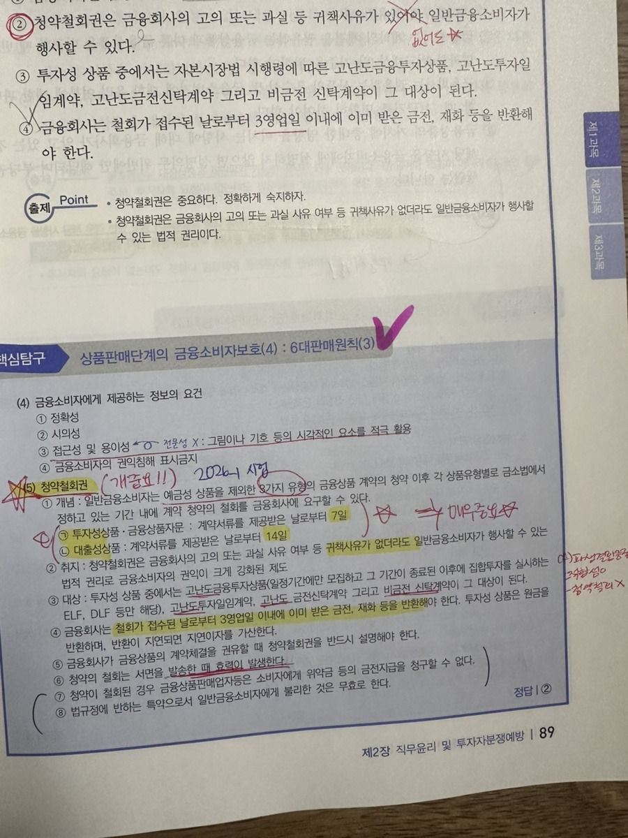 1회독은 빠르게 문제를 풀고 빠르게 오답노트(?)를 했다. 여기서 회독은 처음부터 끝까지 쭈욱 한바퀴가 아니라 과목별로 나눠서 회독을 하도록했다. 즉, 1.펀드일반 과목을 다 풀면 2.파생상품펀드로 넘어가는 것이 아니라 1.펀드일반 과목의 2회독을 했다. 2회독을 할 때는 한 문제 안에 정답지까지 다 알아야한다는 생각으로 앞에서부터 교수님이 강조하신 부분을 책의 문제/개념에 똑같이 표시하면서 복습했다.